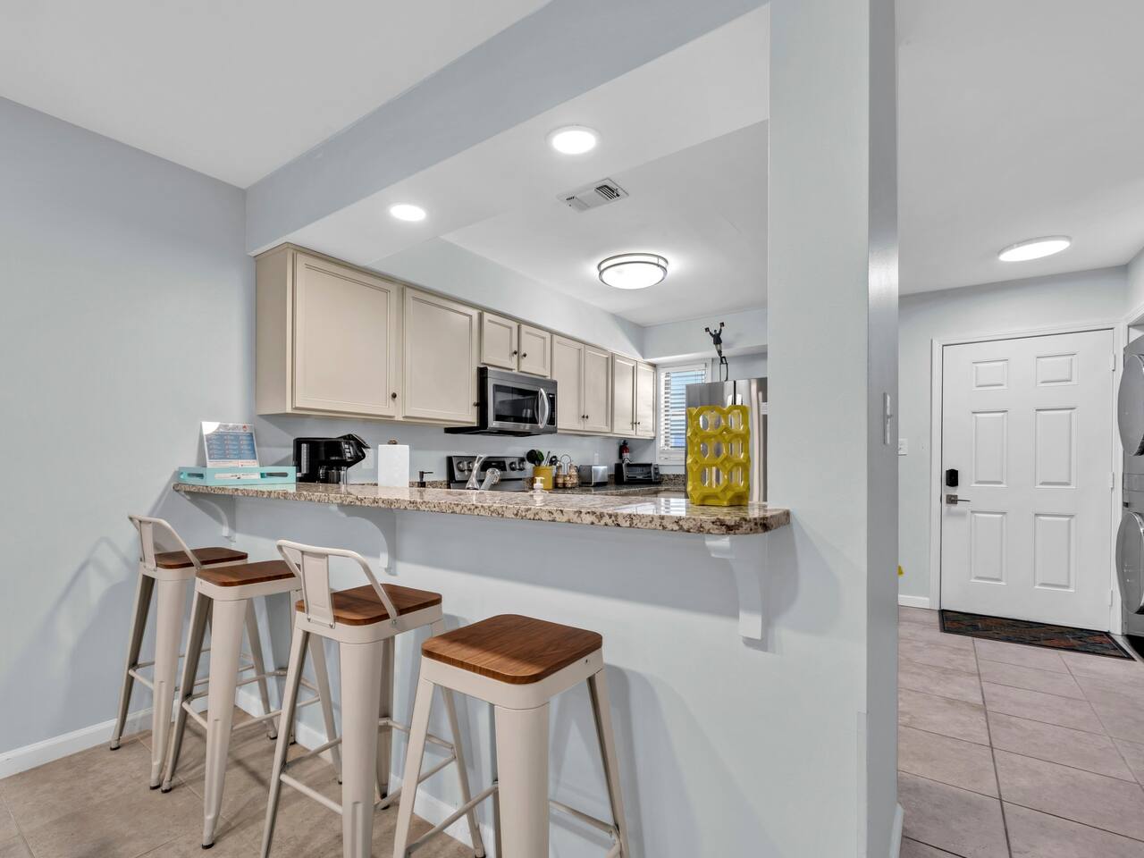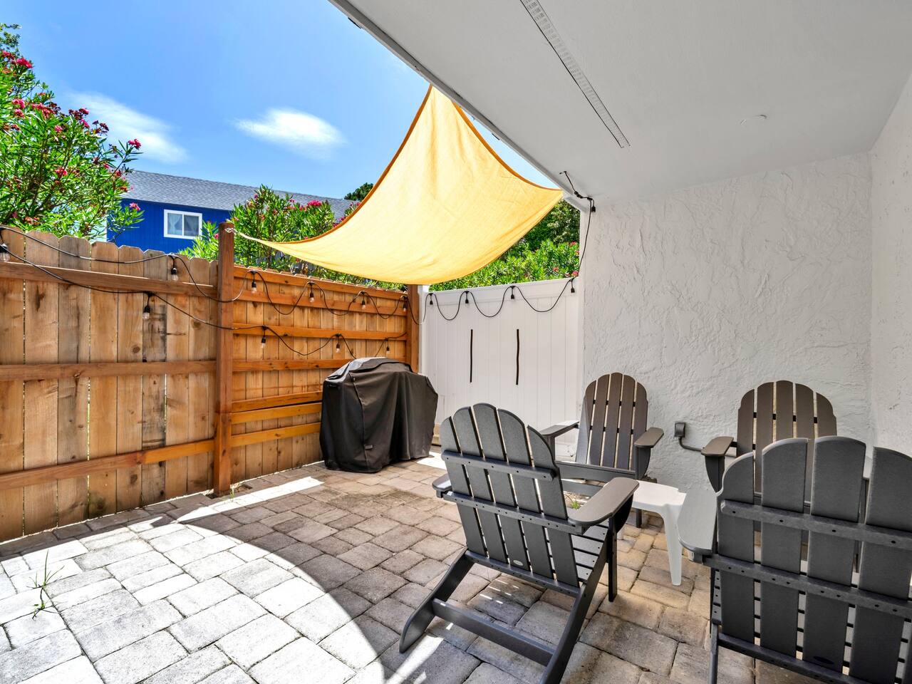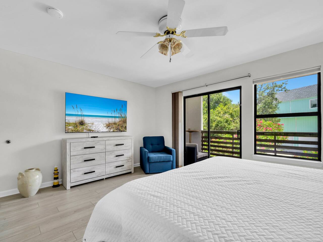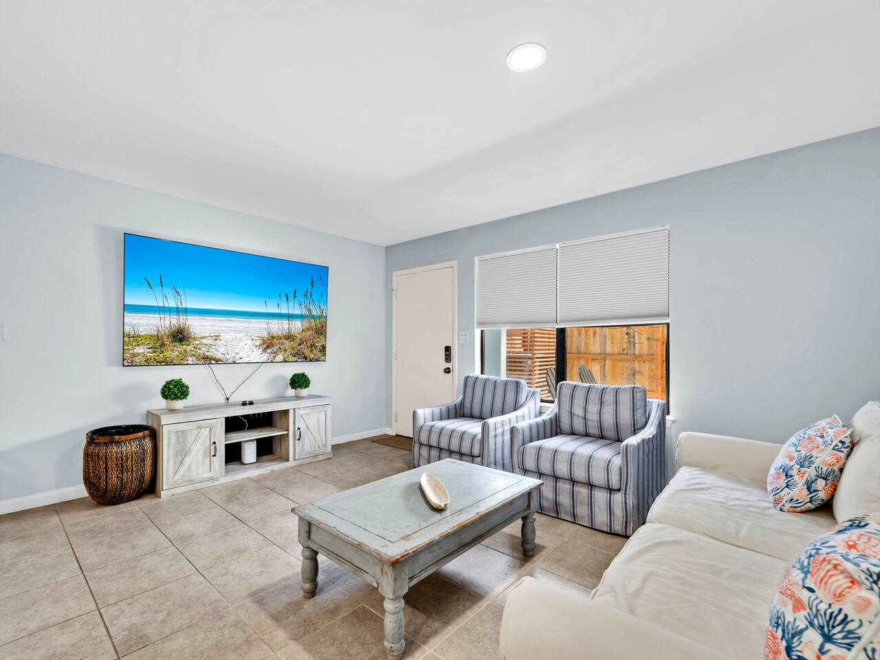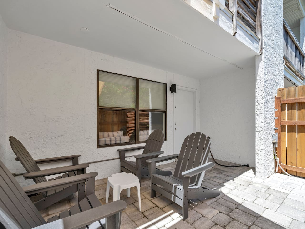 This spacious townhouse features two bedrooms and two and a half bathrooms, comfortably accommodating up to six guests. Upon entering, you’ll find an open-concept kitchen, dining, and living area with plenty of space for everyone to gather. Relax on the sofa and enjoy a movie on the flat-screen TV, or gather around the dining table for family meals or card games. The beautifully appointed kitchen is fully equipped for everything from quick snacks to hearty home-cooked meals. Just off the living room, a private fenced-in patio offers a perfect spot to enjoy the outdoors. Upstairs, both bedrooms include en suite bathrooms and flat-screen TVs for added comfort and privacy. A convenient stackable washer and dryer makes quick cleanups easy. Two parking spaces are located directly in front of the townhouse, allowing you to pull right up, unload your luggage, and stroll to the beach.
