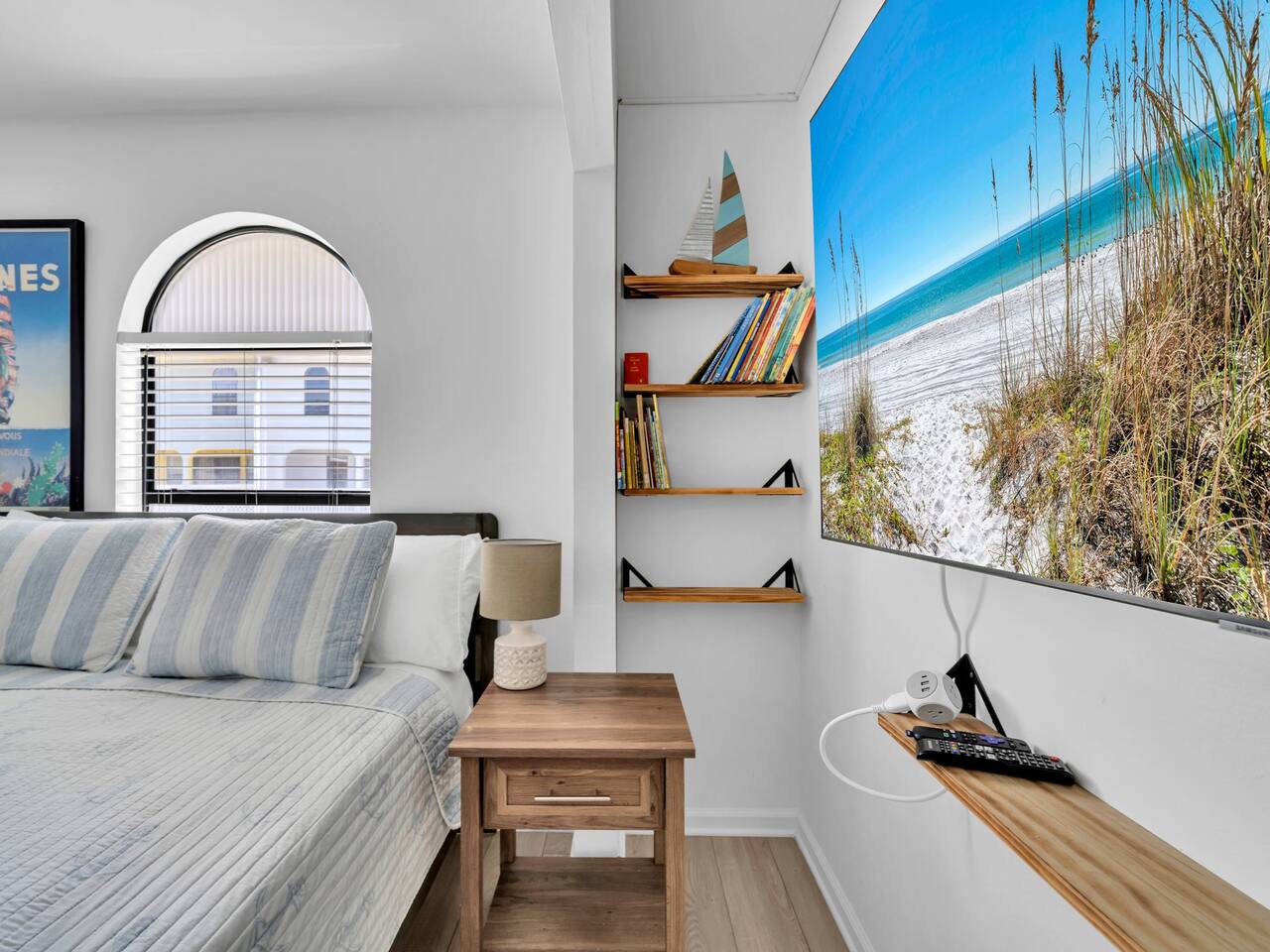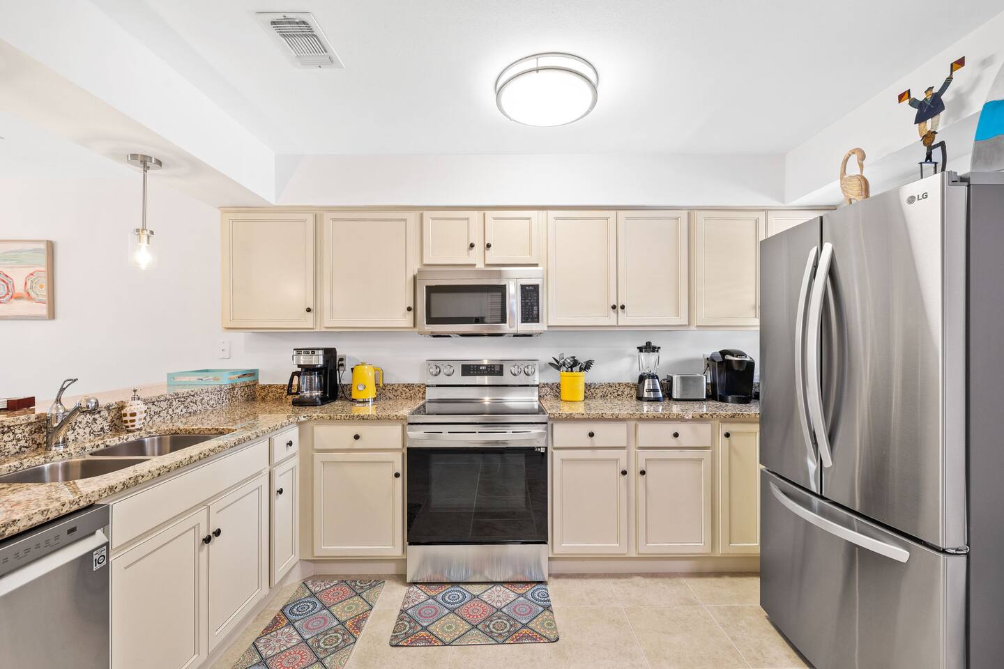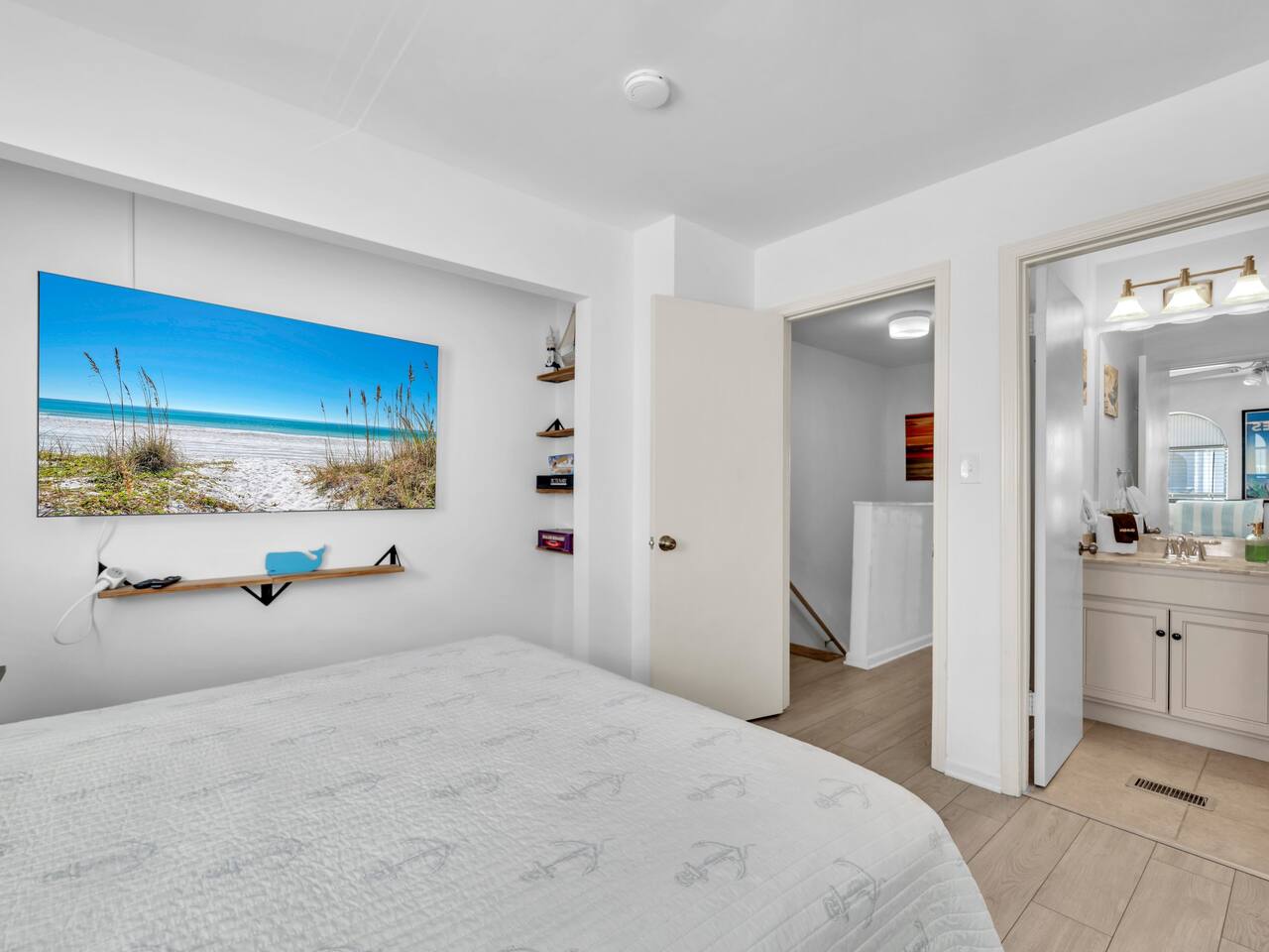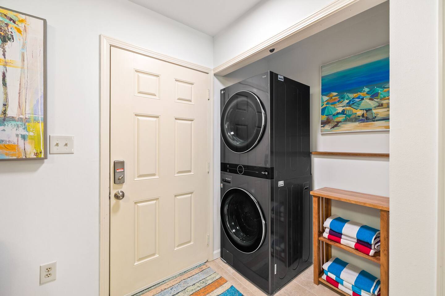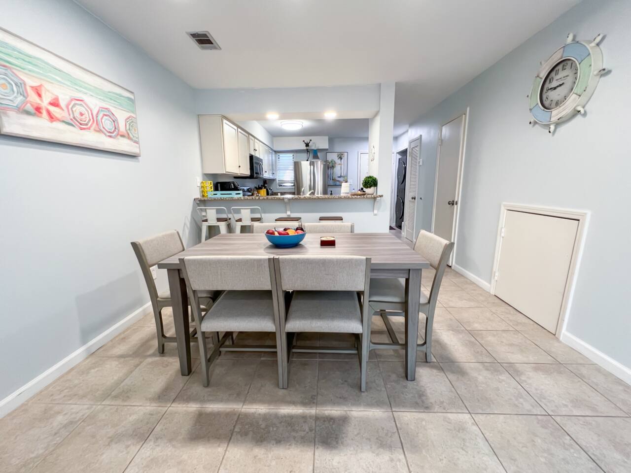 This spacious townhouse features two bedrooms and two and a half bathrooms, comfortably accommodating up to six guests. Upon entering, you’ll find an open-concept kitchen, dining, and living area with plenty of space for everyone to gather. Relax on the sofa and enjoy a movie on the flat-screen TV, or gather around the dining table for family meals or card games. The beautifully appointed kitchen is fully equipped for everything from quick snacks to hearty home-cooked meals. Just off the living room, a private fenced-in patio offers a perfect spot to enjoy the outdoors. Upstairs, both bedrooms include en suite bathrooms and flat-screen TVs for added comfort and privacy. A convenient stackable washer and dryer makes quick cleanups easy. Two parking spaces are located directly in front of the townhouse, allowing you to pull right up, unload your luggage, and stroll to the beach.