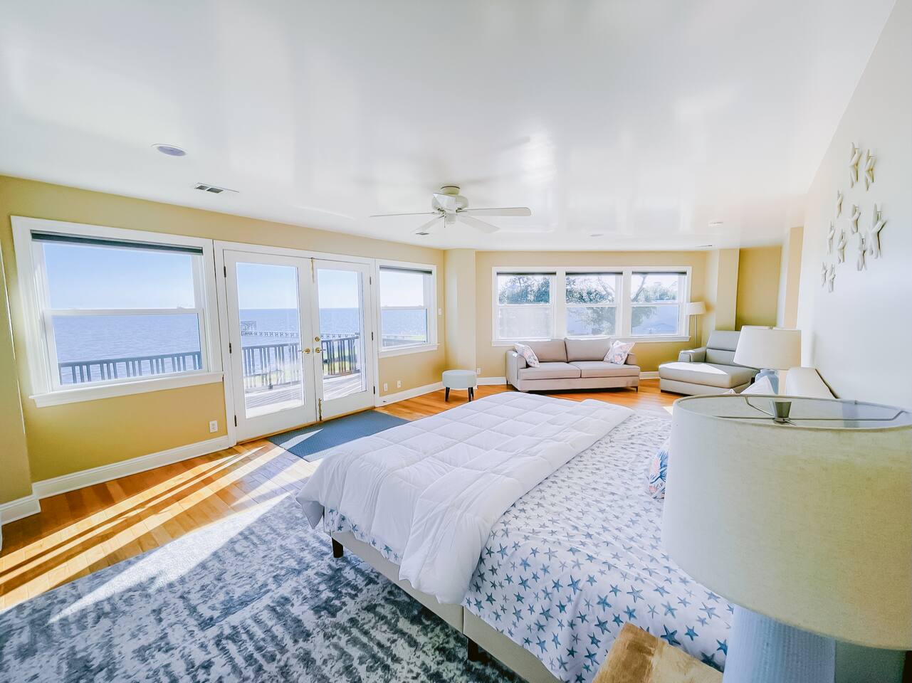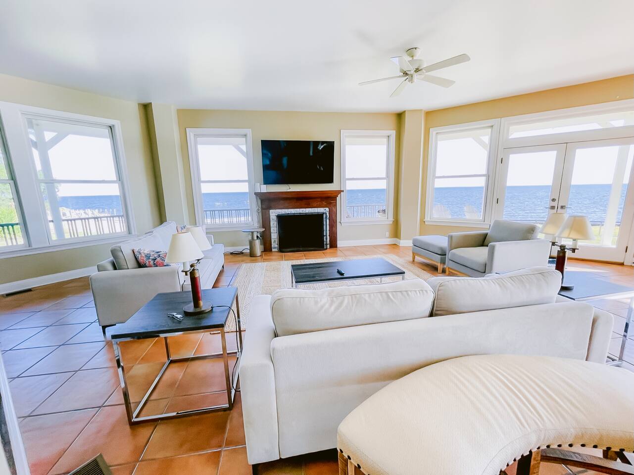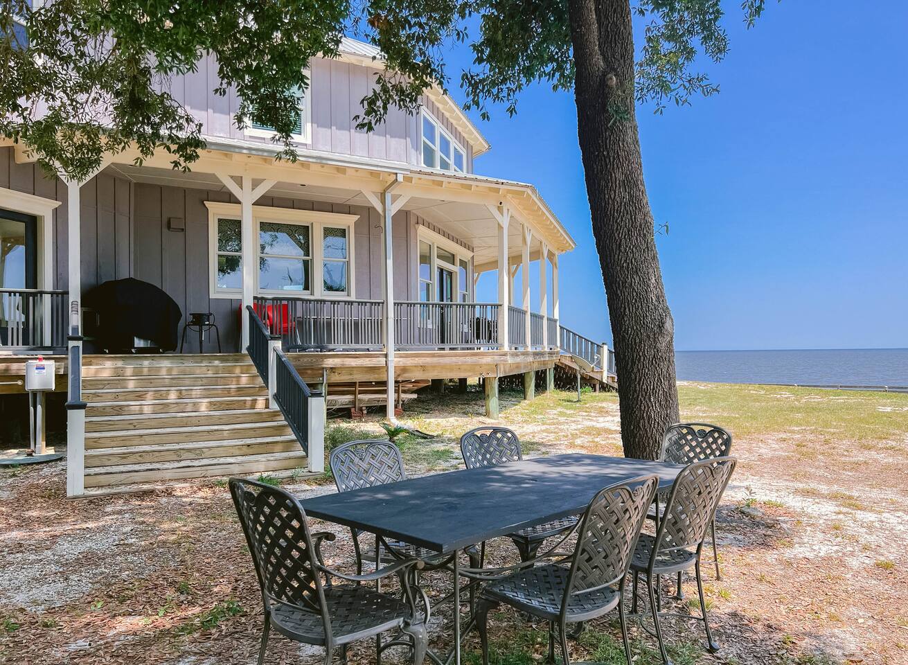 Our property is located on the Gulf near the Belle Fontaine beaches. This home features wrap-around porches, an open floor-plan living space, and panoramic views of the gulf from almost every room in the house. Experience the breathtaking sunrises and sunsets over the Gulf front. Enjoy the peaceful and serene from the porches while watching pelicans fishing, dolphins swimming, and boats going by.